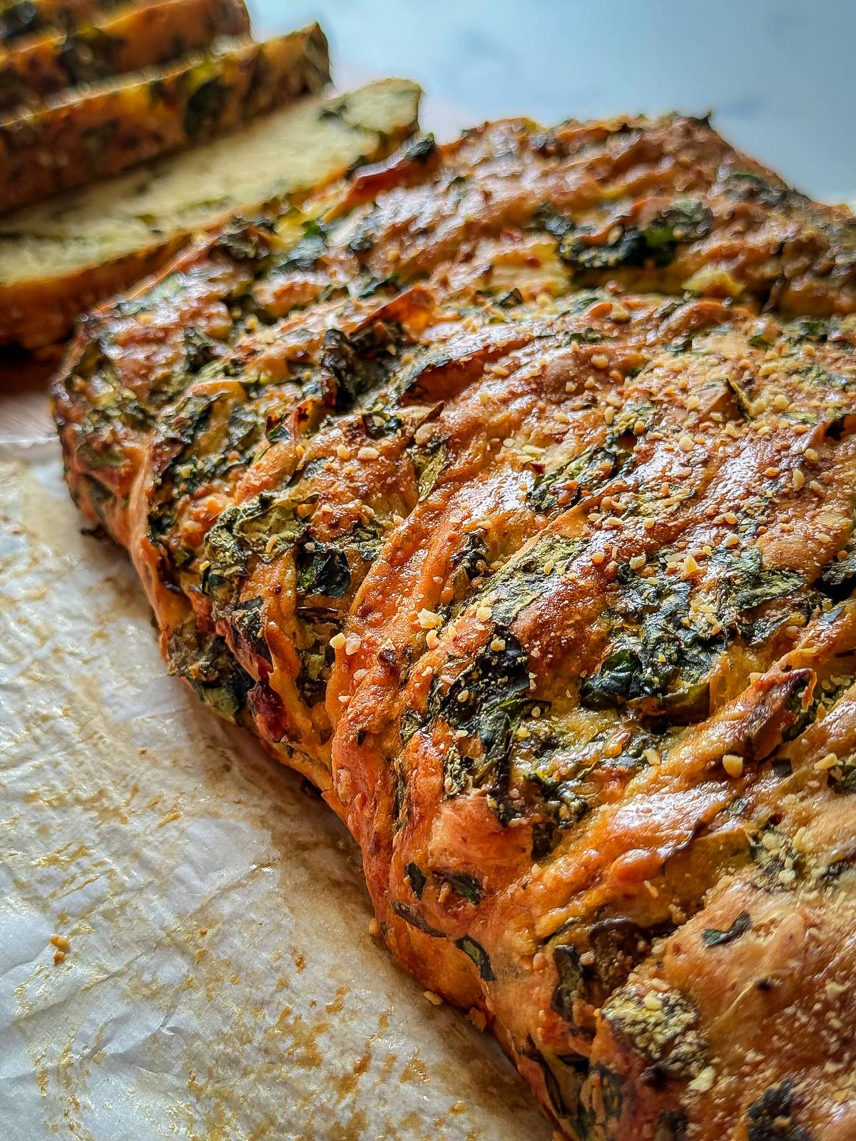 This is no ordinary bread. The dough is rolled, stuffed, and braided around a punchy spinach pesto that is more dry filling than sauce, made with fresh spinach, garlic, oregano, Parmesan, butter, and a smattering of feta. After the second rise, it bakes up with a plush focaccia-like texture and a gorgeous golden crust.